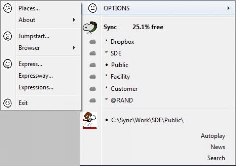 (click image to see detail) ACE features several Windows tray icons. Place Explorer icon expands to something similar to the above menu. This menu consistently allows you to move from place to place. For each person, the menu will be different. From the beginning, ACE was designed to work seamlessly with Windows Live Mesh and Dropbox. ACE then manages flow among these clouds and adapts access to their datapoints. When first installed, ACE prompts you to provide your places of importance. When fully implemented, your simplified access to ACE places can be done via keyboard shortcuts, phrases, mouse, or touch in 2013. |